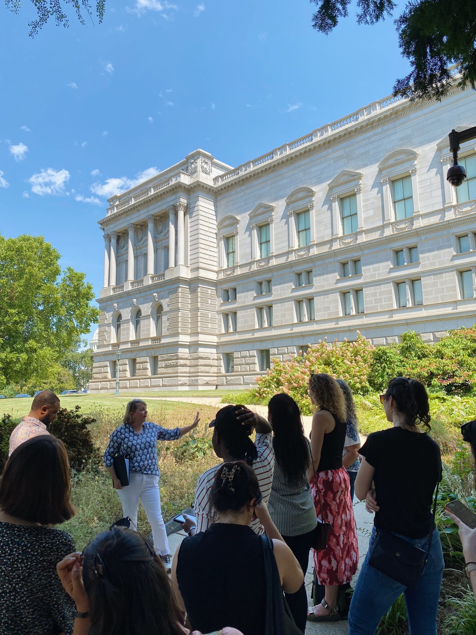 Day Three began with a preservation walking tour led by one of MTFA Design + Preservation’s Architectural Conservators who guided the group through some of her past projects. We learned about stone conservation methods used during the restoration of the Folger Theatre’s marble exterior, laser scanning techniques used at the Library of Congress, and various material analyses that were instrumental in the restoration of the Canon House Office Building’s interior. In the afternoon, we went to the National Building Museum which houses the offices of the U.S. Commission of Fine Arts. Here, we met with the Commission’s Secretary and learned about their role in advising the federal government and guiding the architectural development of Washington, DC.